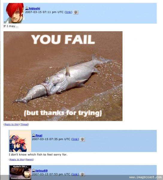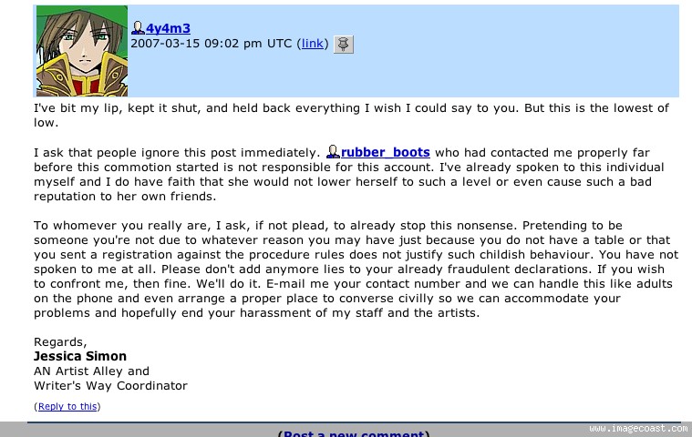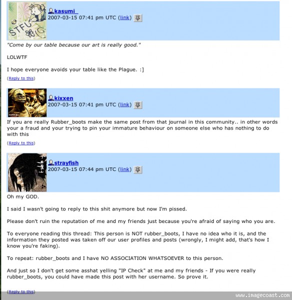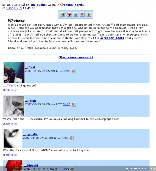 The epic tale of Anime North AA continues. (Thanks to dejana for finding this.)Last time, on fandom_wank...This time, on fandom_wank:an_aa_sucks's true identity is revealed! People are unimpressed. There are fish macros, giant sparkle text, multiple accusations of false identity, and sockpuppets of sockpuppets!Another post is made by jocatscat, outing an_aa_sucks as rubber_boots. But wait! Is jocatscat s/h/itself a sockpuppet? And can anyone really take a sockpuppet of a sockpuppet's accusations of sockpuppetry seriously?Finally, the truth comes out. Or does it? Is rubber_boot the same person as rubber_boots? Just how many socks are we dealing with here? And do the members of anime_north really give a shit any more?Damn, I use far too many exclamation points.ETA: Aaaaaand the mod has no clue what is going on. (Thanks monsley!)ETA#2: an_aa_sucks and jocatscat have both been banned, so the posts are no longer there. D: Anyone have screencaps?ETA#3: Screencaps of the first post can be found here- thanks blackhat!ETA#4: jocatscat is not pleased.