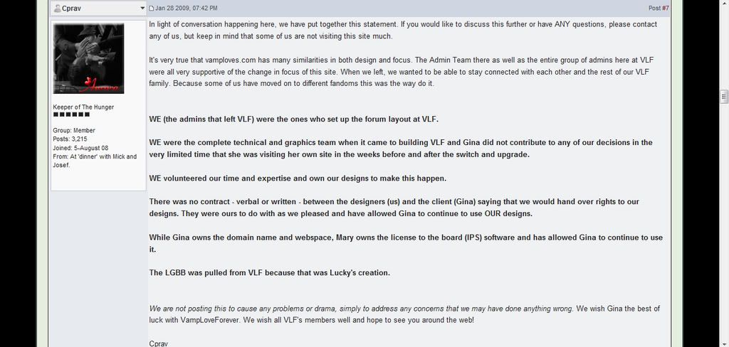 To sum up: The mods from MoonlightLine.com who all resigned when Sleezer started to smell bad--jumped to their new site MoonlightForever.com--which is now VampLoverForever.com. D: When they changed the name they also made it a site for Twilight/Moonlight/Trueblood, which apparently happened with zero warning to users.