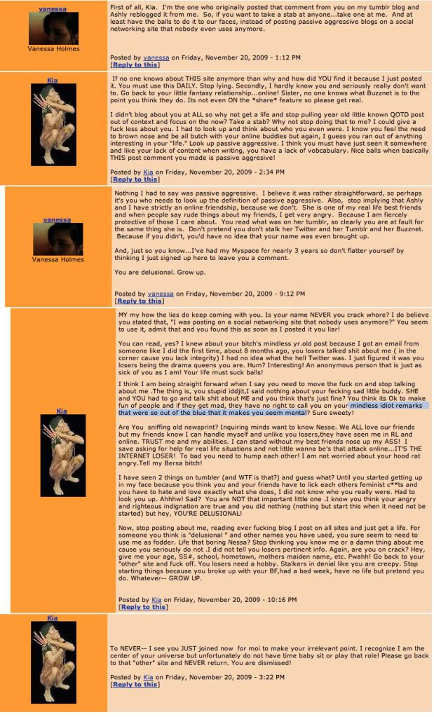 Her long-winded attacks on high-profile buzznet members--a mod included--eventually resulted in her being banned from buzznet. So, feeling extra-persecuted, Kia fired off a cease & desist to Buzznet staff.