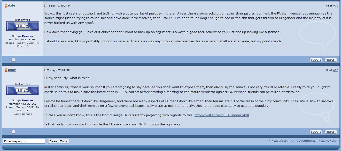 Now, I know that Dragoneer (Preyfar), the guy who runs FA has said some pretty nasty things about FurNation and myself in the past, but I have never bothered to respond to them before. But to stoop as low as to do this is really something I can no longer tolerate. How do I know that it was someone from FA's staff who did this? This I will not say, as I am not going to implicate my source and loose a good friend.