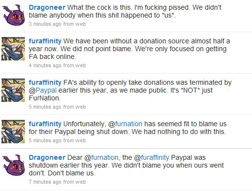 Suddenly, There was a post on the front page of FurNation, a 'rival site' accusing FurAffinity admin Dragoneer of reporting FN to Paypal, thereby getting Paypal to suspend the account.