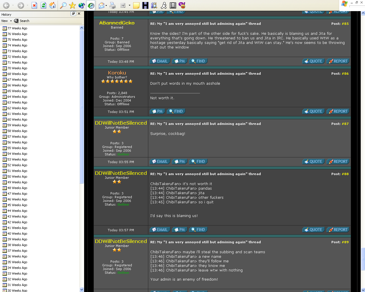 One of the administrators, Koroku, makes a resignation post. However, he had no intention of actually resigning, and several members call him on it. The wank starts off when one member, CantStopTheGecko, makes a comment about it.