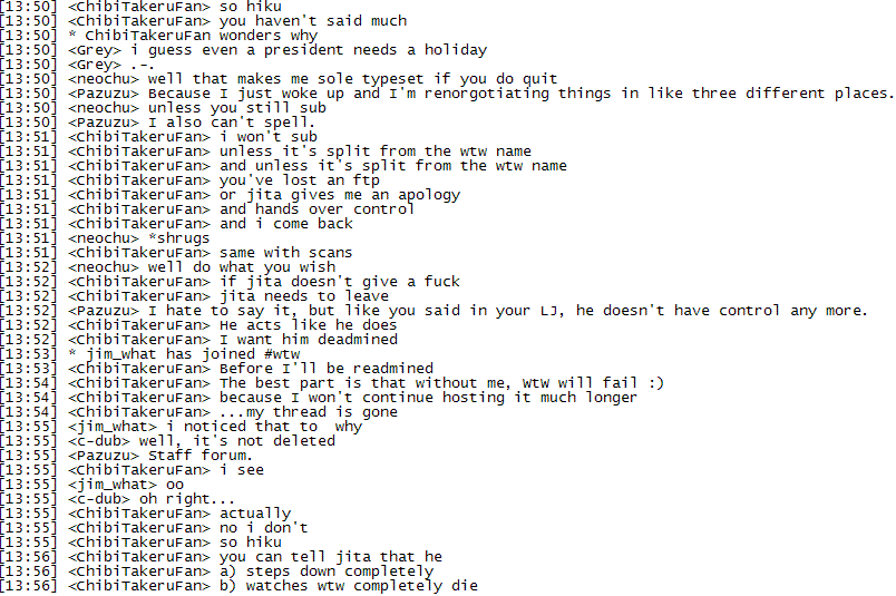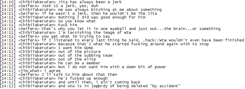 2: Jita, the other active administrator, is being overly critical of my work, so I don’t like him. (Also note that Jita is the quality checker for the subtitling group and pretty much has the final say for those things. This becomes important later.)