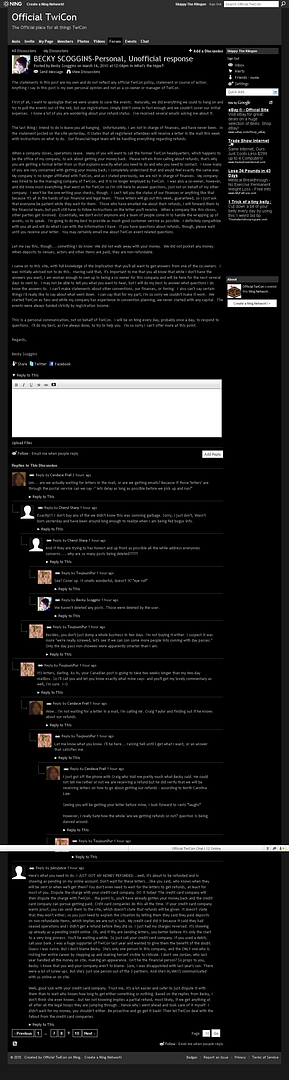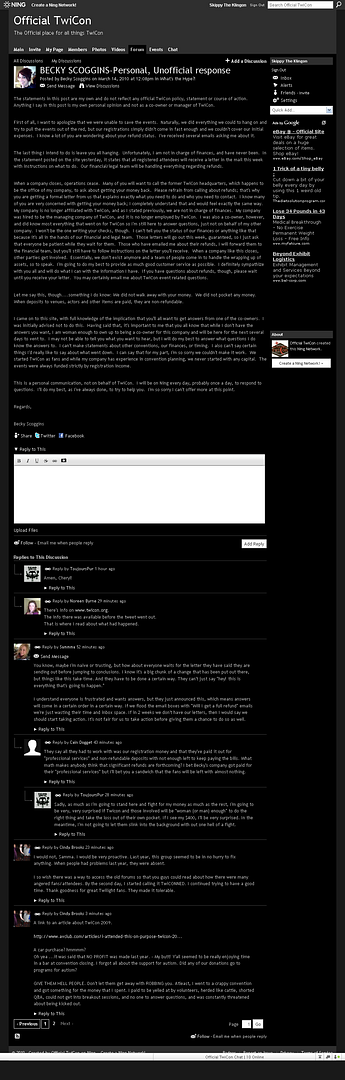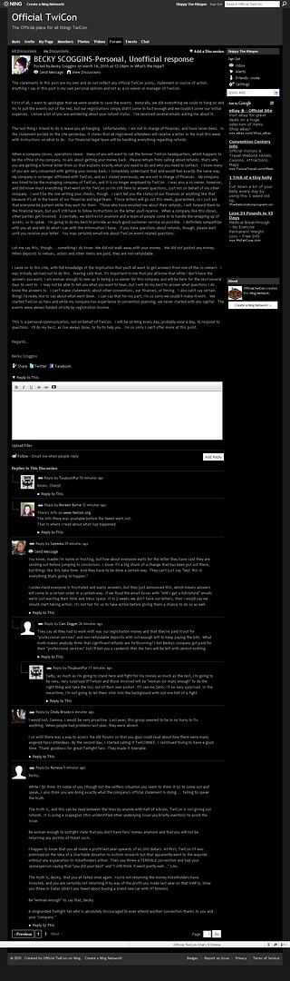 There is confusion on the forum, especially about how they get refunds since the announcement didn't bother to mention how you go about this. Becky Scoggins, one of the Twilight Partners, posts a personal apology that states it's not an official statement from Twicon. Noneya calls bullshit on Becky's apology pointing out the discrepancies in her statements and her post gets deleted . Some people notice this , but Becky is claiming the threads were deleted by the users.