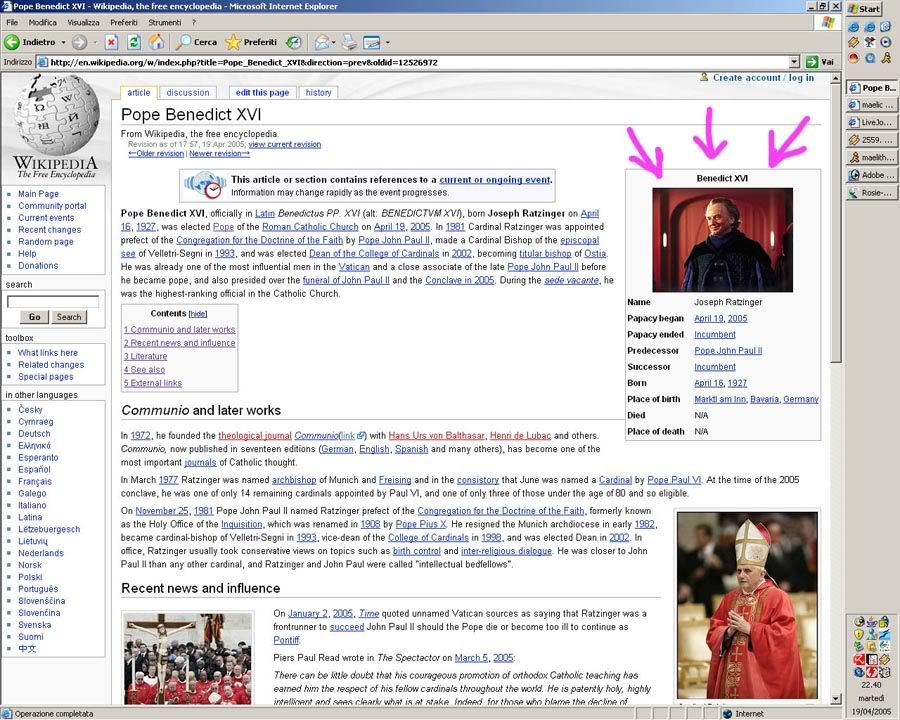 Heh, I caught a screenshot of the wikipedia entry for Benedict XVI *before* they changed it back.