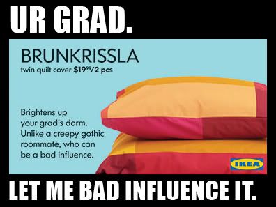 How many goths does it take to build some fine Swedish furniture? Ikea runs an advert that a particular product will brighten up your dorm room, "unlike a creepy gothic roommate, who can be a bad influence." Gothfash, the lj goth fashion community reacts predictably, with a post titled, "I am outraged by this and I am going to write a letter." Don't miss the derrogatory useage of the word 'norms' and how the oppression of the pasty, whiney, and emmaciated is ABSOLUTELY LIKE the systemic racism directed at African Americans! The icing on the cake is that the OP, Thanks to a mouse for the head's up! |