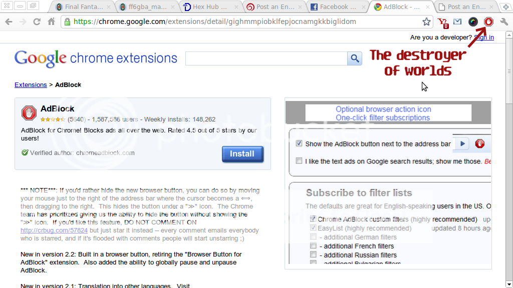 Your Button Is Bad and You Should Feel Bad AdBlock for Chrome updated recently. Among other changes, there is now an AdBlock button that sits in the extension bar and can't be disabled. This is the button that ends the universe. The extension's author blames the inability to disable the button on Chrome's developers, links to a bug report and encourages users to upvote it, and posts instructions for hiding the button. Alas, the instructions just shorten the extension button space and cause expansion arrows to appear, which people hate almost as much as they hate the button. Most commenters also have great difficulty understanding the instructions in the first place. Cue 300+ comments of seething button-rage. I can't link to individual comments, but highlights include the straightforward: Noooo! I don't want button!!! The aesthetically affronted: This is a useful extension, but I've had to disable it because the large, bright red button destroys the look of my toolbar. It was functioning fine for months without a giant red stop sign smacking me in the periphery of my vision. The scatological: crap button ,,ur brain is full of semen?? Asking to drag a button to the right to hide it is like saying if you don't like a pile of poo in the middle of your room just put a rug over it. The baffling: Thanks but your acting like google on youtube And occasionally the defensive: Adblock can put a button on my bloody forehead if it wants to, it's that important. For reference, the button itself looks like this. There's also some bonus wanking about AdBlock now requiring access to your browsing history. |
